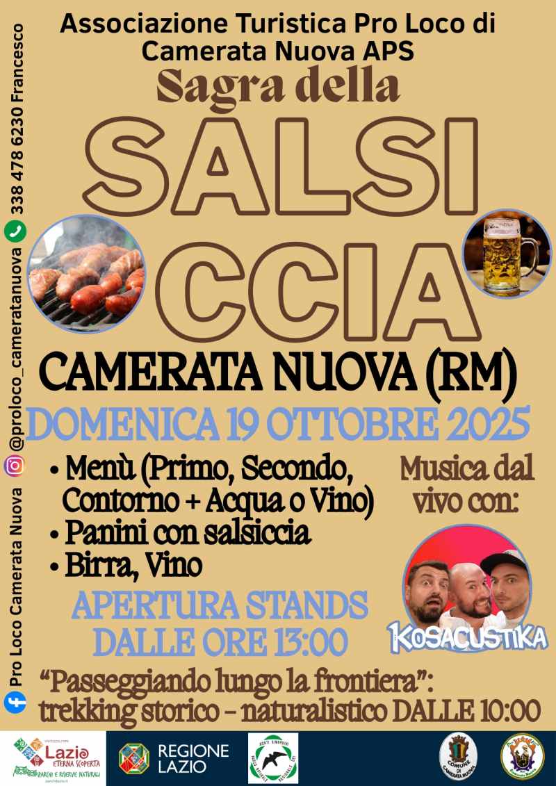 La Sagra della Salsiccia di Camerata Nuova (RM) si terrà domenica 19 ottobre 2025 in Piazza Roma, con grigliate, escursioni nei Monti Simbruini e musica dal vivo.