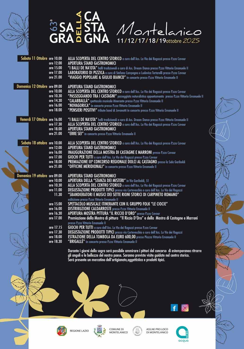 La Sagra della Castagna di Montelanico è un evento storico e molto sentito, che celebra il frutto simbolo dell'autunno in questo piccolo borgo immerso nei boschi di castagno dei Monti Lepini, in provincia di Roma.