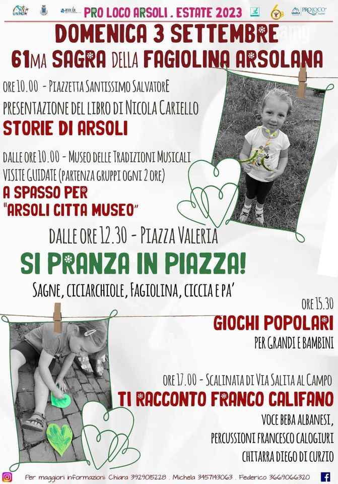 La SAGRA DELLA FAGIOLINA ARSOLANA ripropone le semplici ricette contadine cucinate ancora secondo le antiche modalità e con prodotti locali: "ciciarchiole", "fagiolina", "salsicce e braciole", "pane casareccio" e dell'ottimo vino cesanese.