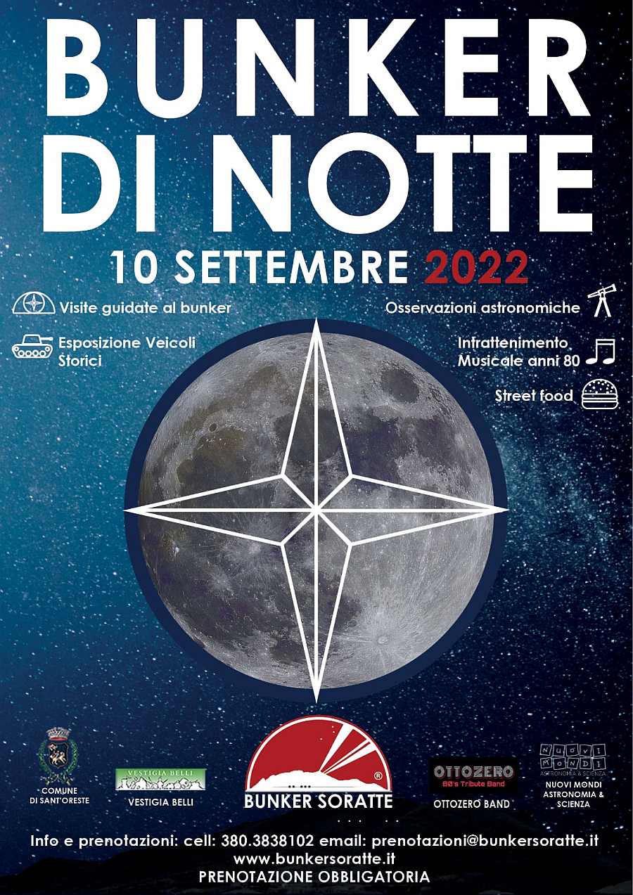 Sabato 10 settembre (dalle 18:00 alle 22:00), a Sant'Oreste (RM), l'Associazione culturale Bunker Soratte organizza dei tour guidati a numero chiuso per scoprire, conoscere e toccare con mano un'importantissima pagina di storia del '900, dal Fascismo alla Seconda guerra mondiale, dalla Guerra Fredda ai nostri giorni, a soli 35 km da Roma.