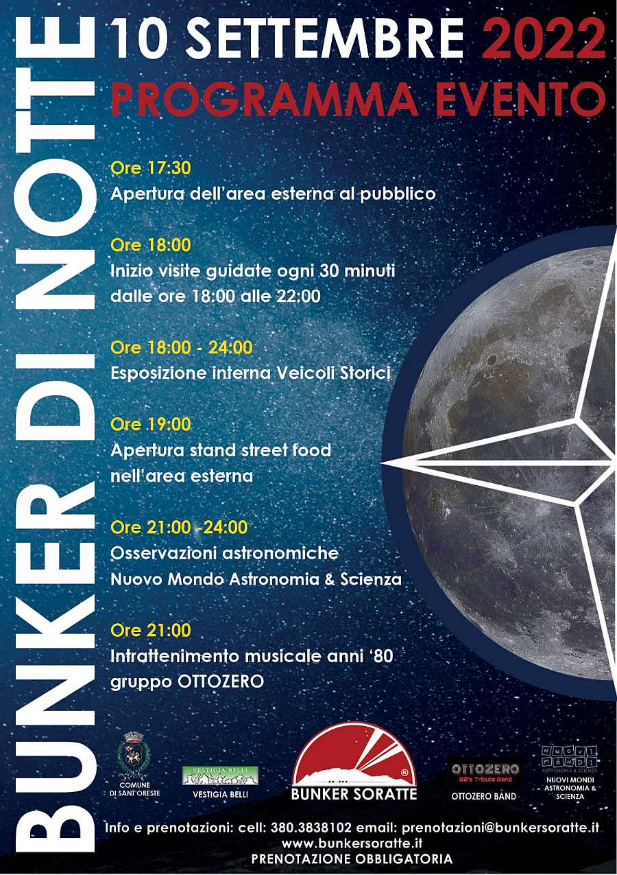 .Le prenotazioni sono obbligatorie per mail su prenotazioni@bunkersoratte.it o per telefono al 380 383 8102 entro e non oltre le ore 19:00 del venerdì 9 settembre.