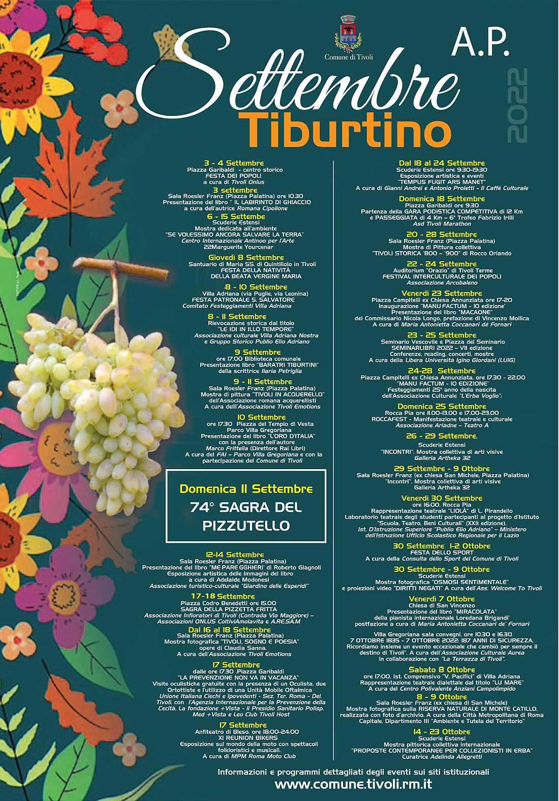 La manifestazione, organizzata dal Comune di Tivoli, nata per celebrare la fine dell’estate e dare il benvenuto all’autunno, anche quest’anno si presenta con un programma fitto di appuntamenti che spaziano dalle sagre alle esposizioni artistiche, dalle rievocazioni storiche alle esibizioni teatrali, nei quali fa spicco la Sagra del Pizzutello, con le celebrazioni della cosiddetta “uva corna” l’11 settembre.