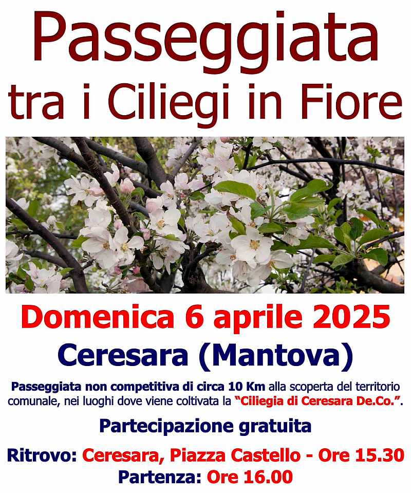 Come ormai tradizione, la “Compagnia delle Torri”, con il Patrocinio del Comune di Ceresara, organizza domenica 6 aprile 2025 una passeggiata non competitiva di poco meno di 10 Km alla scoperta del territorio comunale, nei luoghi dove viene coltivata la “Ciliegia di Ceresara De.Co.”, che toccherà le principali coltivazioni al momento della fioritura primaverile degli alberi.