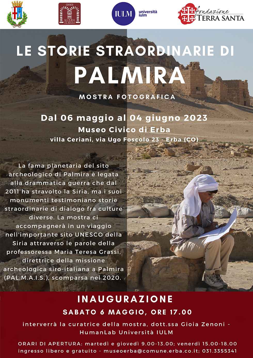 Verrà inaugurata sabato 6 maggio, alle ore 17.00 presso il Museo Civico di Erba la mostra fotografica "Le storie straordinarie di Palmira", realizzata a cura di HumanLab IULM in collaborazione con Fondazione Terra Santa.
