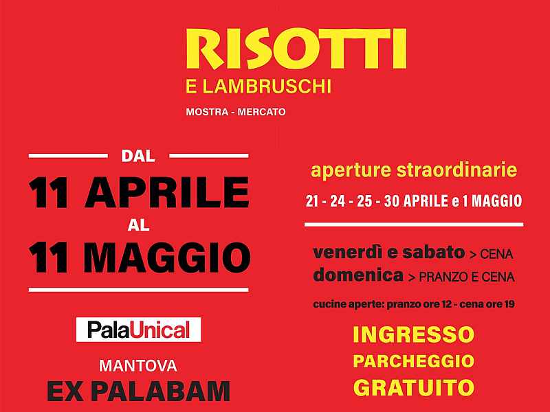 La mostra mercato terminerà domenica 11 maggio con aperture straordinarie il 21, 24, 25 e 30 aprile e il 1° maggio e offrirà a tutti i visitatori la possibilità di degustare 50 tipi di risotti della cucina mantovana e lambruschi di diverse cantine del territorio grazie alla collaborazione di aziende ed associazioni.