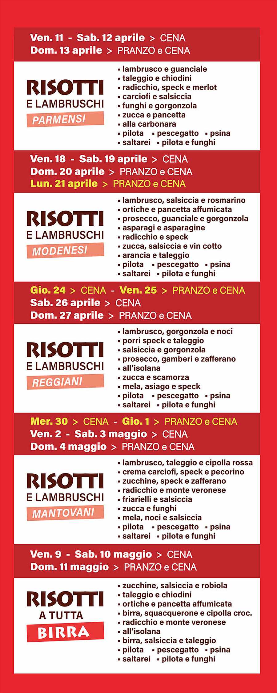 Venerdì 11 a cena, sabato 12 a cena e domenica 13 aprile a pranzo e cena, si potranno degustare il risotto al lambrusco e guanciale, taleggio e chiodini, radicchio speck e merlot, carciofi e salsiccia, funghi e gorgonzola, zucca e pancetta, pilota, saltarei, pescegatto, psina, pilota e funghi. Il risotto special di questo weekend sarà alla carbonara. I primi piatti saranno accompagnati dai Lambruschi parmensi.