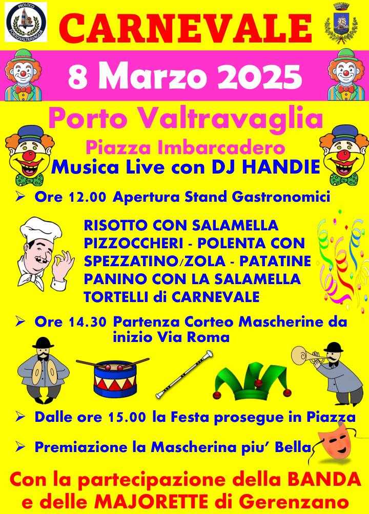 Ore 14.30 partenza del corteo mascherato che vedrà la straordinaria partecipazione della Banda e delle Majorette di Gerenzano, il corteo attraverserà il centro storico di Porto Valtravaglia per giungere in piazza Imbarcadero ( in riva al lago) dove la festa proseguirà con musi va divertimento e tanto buon cibo.