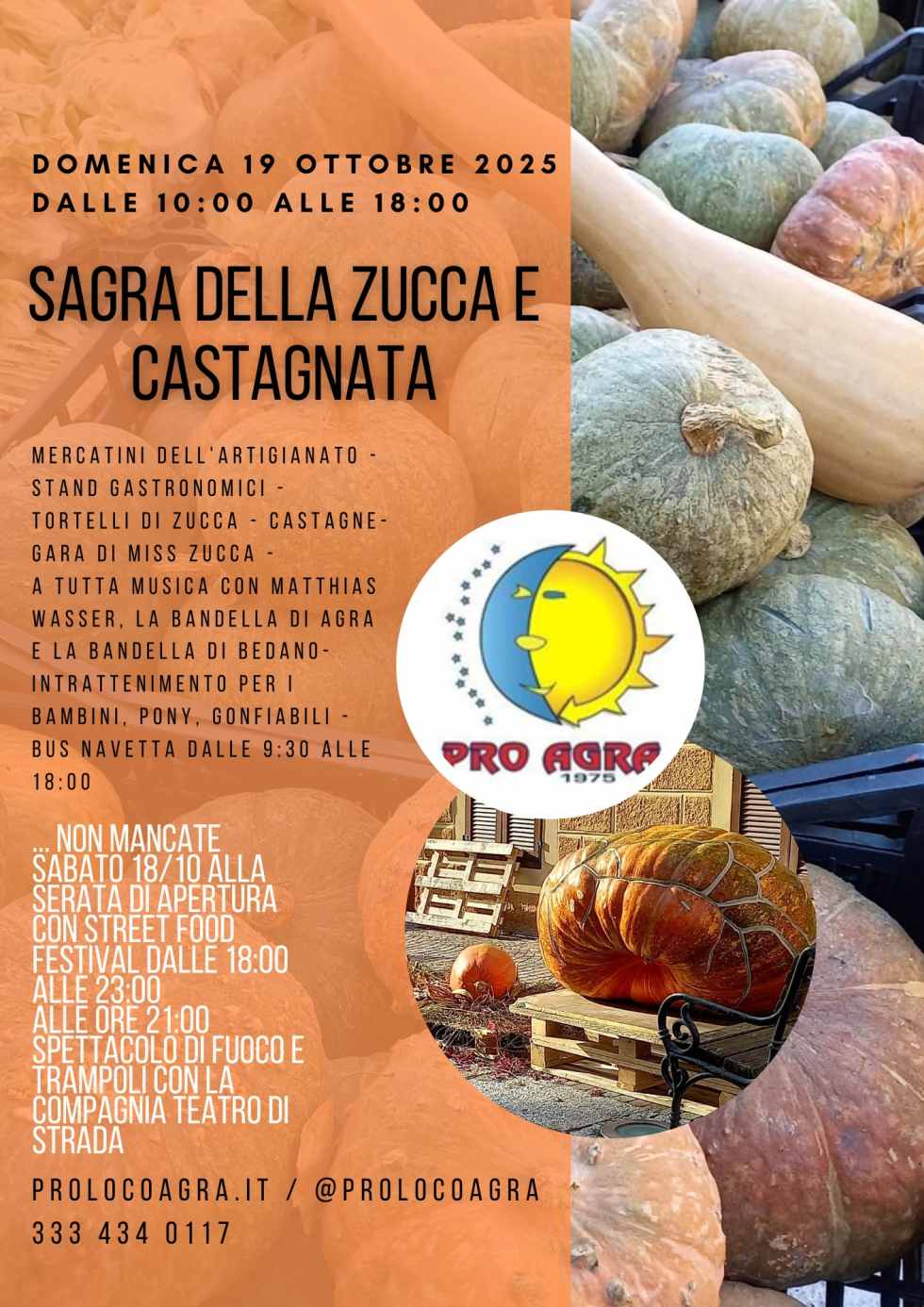 Domenica 19 invece si terrà la gara di Miss Zucca, il tradizionale mercatino dell'artigianato e delle specialità locali che si sviluppa lungo un percorso a piedi, all'interno del nucleo storico del paese di Agra, con tante bancarelle per tutti i gusti.