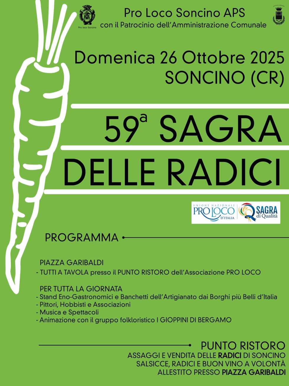 Organizzata dalla Pro Loco Soncino APS, con il patrocinio del Comune di Soncino, la manifestazione rende omaggio a una delle eccellenze gastronomiche locali: la Radice Amara di Soncino, un prodotto unico che da generazioni porta sulle tavole italiane il gusto e la genuinità della terra.