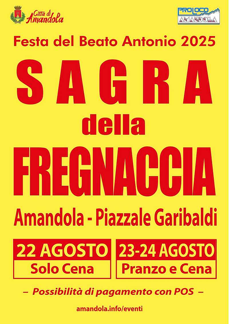 La sagra della fregnaccia, che si ripete ogni anno in occasione dei festeggiamenti agostani in onore del Beato Antonio e che quest’anno si svolge il 23 agosto solo a cena e 24 agosto, sia a pranzo che a cana, è nata per conservare gli antichi sapori di una volta e per far gustare tutta la bontà e la genuinità della vera tradizione Amandolese.