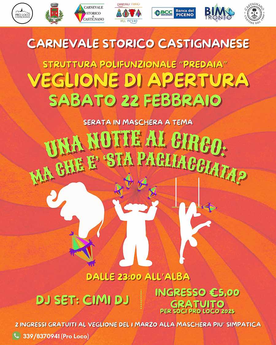 Sarà l’occasione perfetta per dare vita a un circo fuori dal comune, per divertirsi insieme, brindare, ballare tutta la notte e scaldare i motori di questa edizione 2025 dello storico Carnevale di Castignano.
