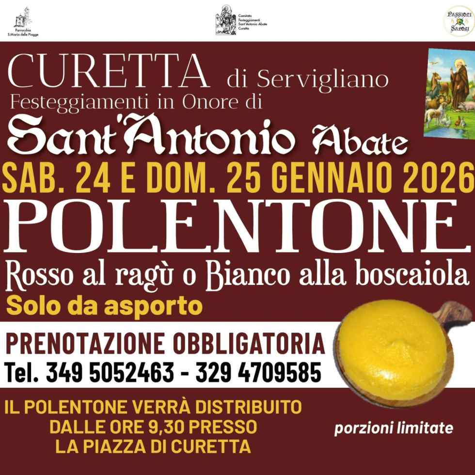 La Parrocchia di Santa Maria delle Piagge di Curetta e il Comitato Festeggiamenti di Sant’Antonio Abate, in collaborazione con lo staff cucina e logistica del Rione Paese Vecchio, propongono la tradizionale FESTA DI SANT’ANTONIO ABATE che si terrà nella Frazione di Curetta DOMENICA 25 GENNAIO 2026.