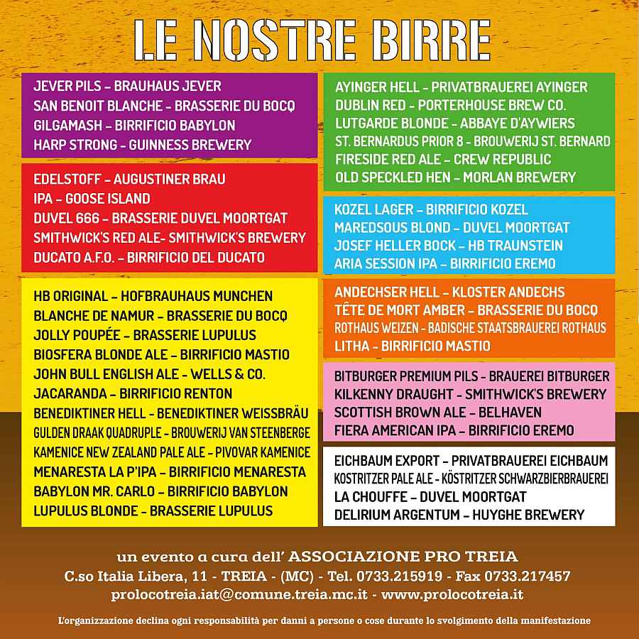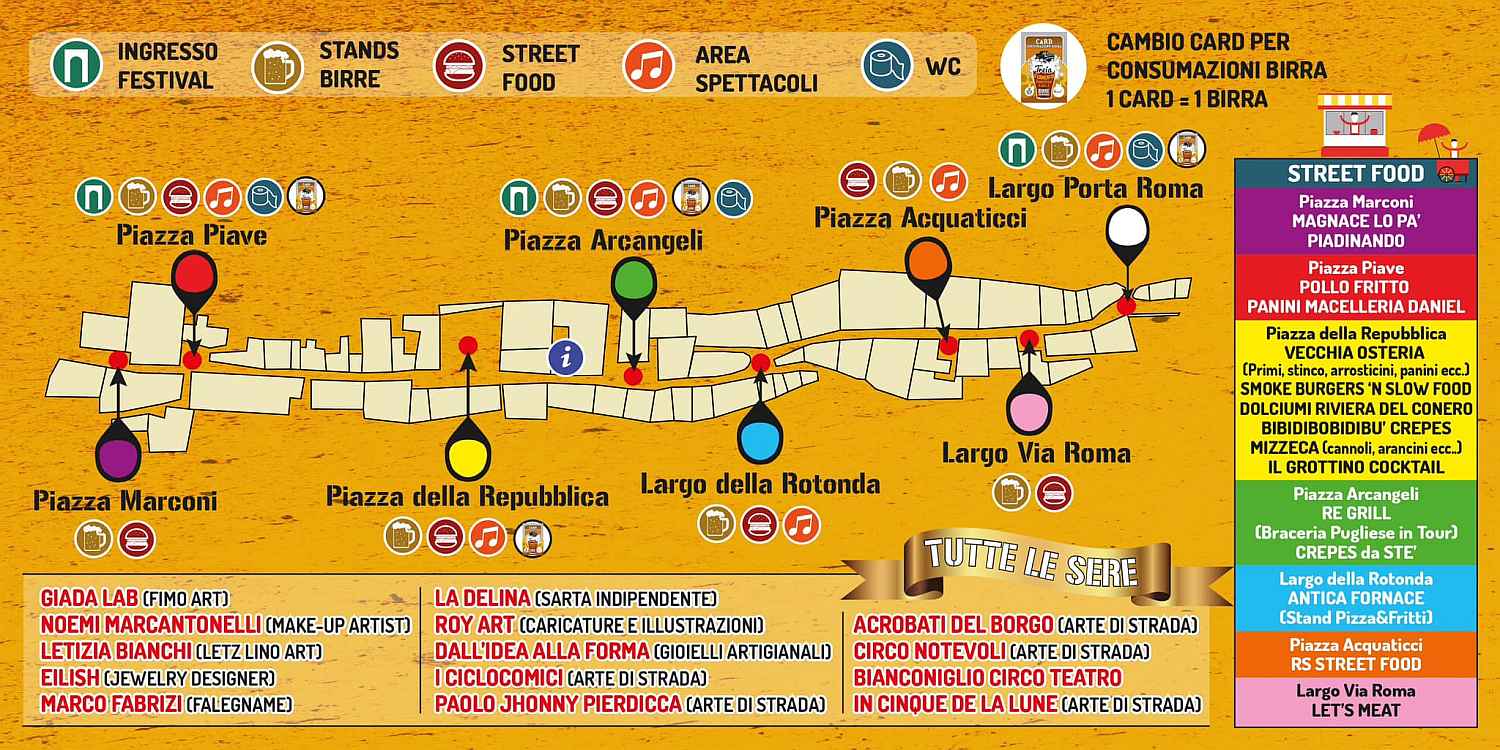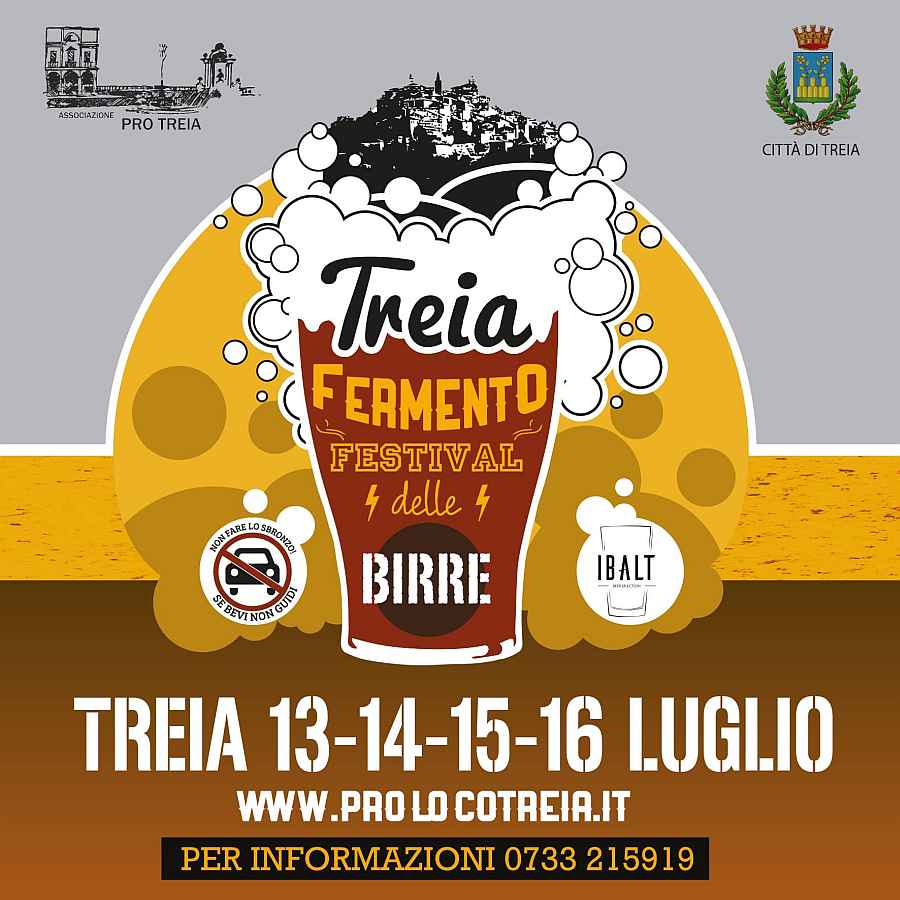 FERMENTO - Festival delle Birre si tiene il 13-14-15-16 luglio 2023 nel centro storico di Treia, dove troverete dislocati in varie postazioni più di 35 tipi di birre artigianali e di qualità, da degustare accompagnati da Street Food e conditi con l’animazione di molti gruppi musicali siti in diverse postazioni, artisti di strada itineranti, arti visive e tanto divertimento!