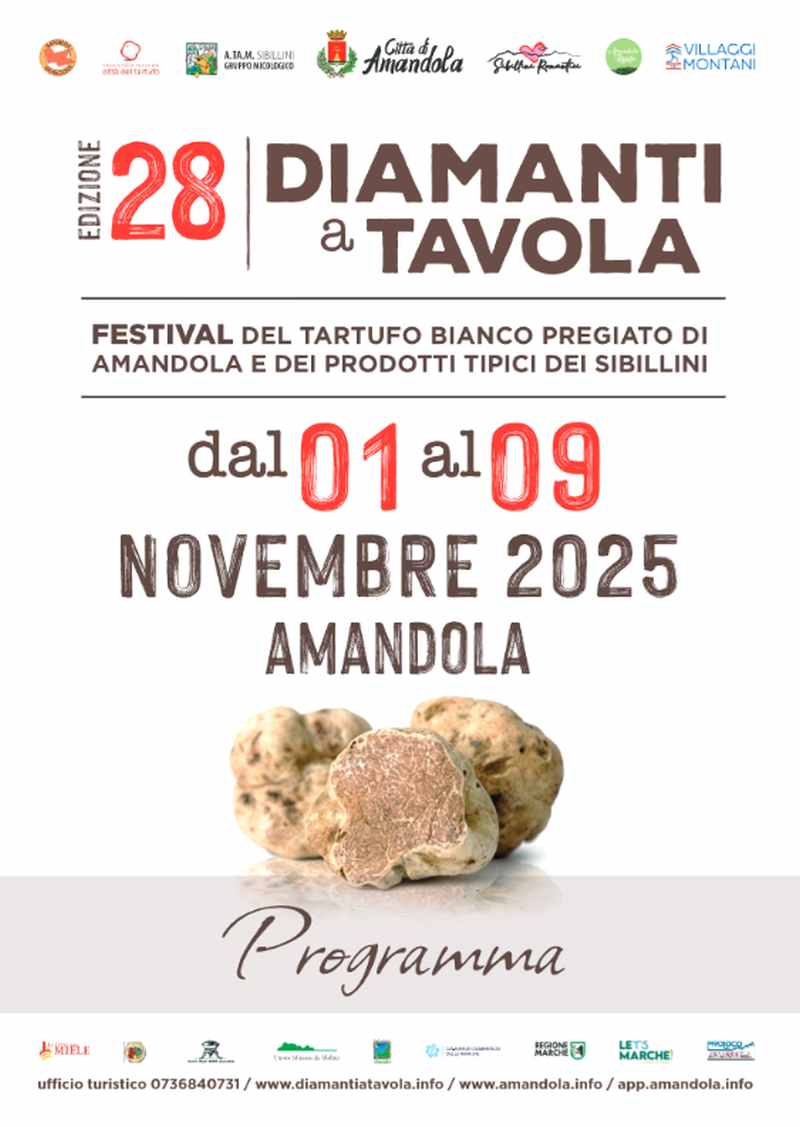 E' giunta alla 28^ edizione la manifestazione Diamanti a Tavola, Festival del Tartufo Bianco Pregiato dei Sibillini che promuove e valorizza il più illustre frutto dei boschi di Amandola e dell’entroterra Fermano.