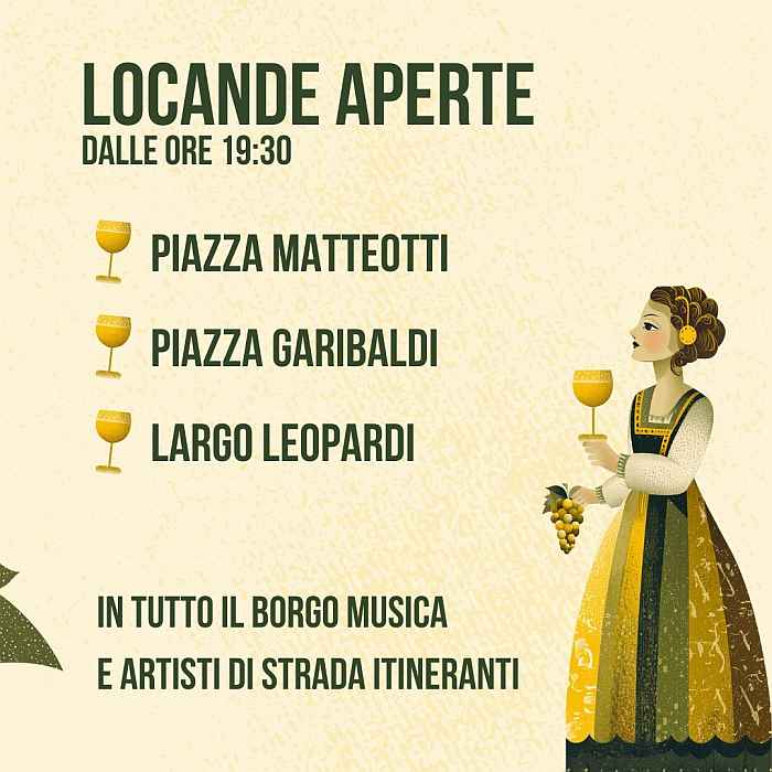 Dal 12 al 21 settembre il centro storico si veste a festa: drappi colorati, locande piene di buon cibo, calici di vino, musica, mercatini, spettacoli e tanta voglia di stare insieme.