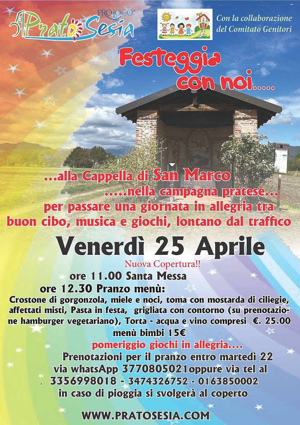 La Pro Loco di Prato Sesia,anche quest'anno con la collaborazione del Comitato Genitori, torna ad invitarvi a partecipare alla consueta festa immersa nel verde della campagna pratese, dove è sorta la cappella di San Marco.
