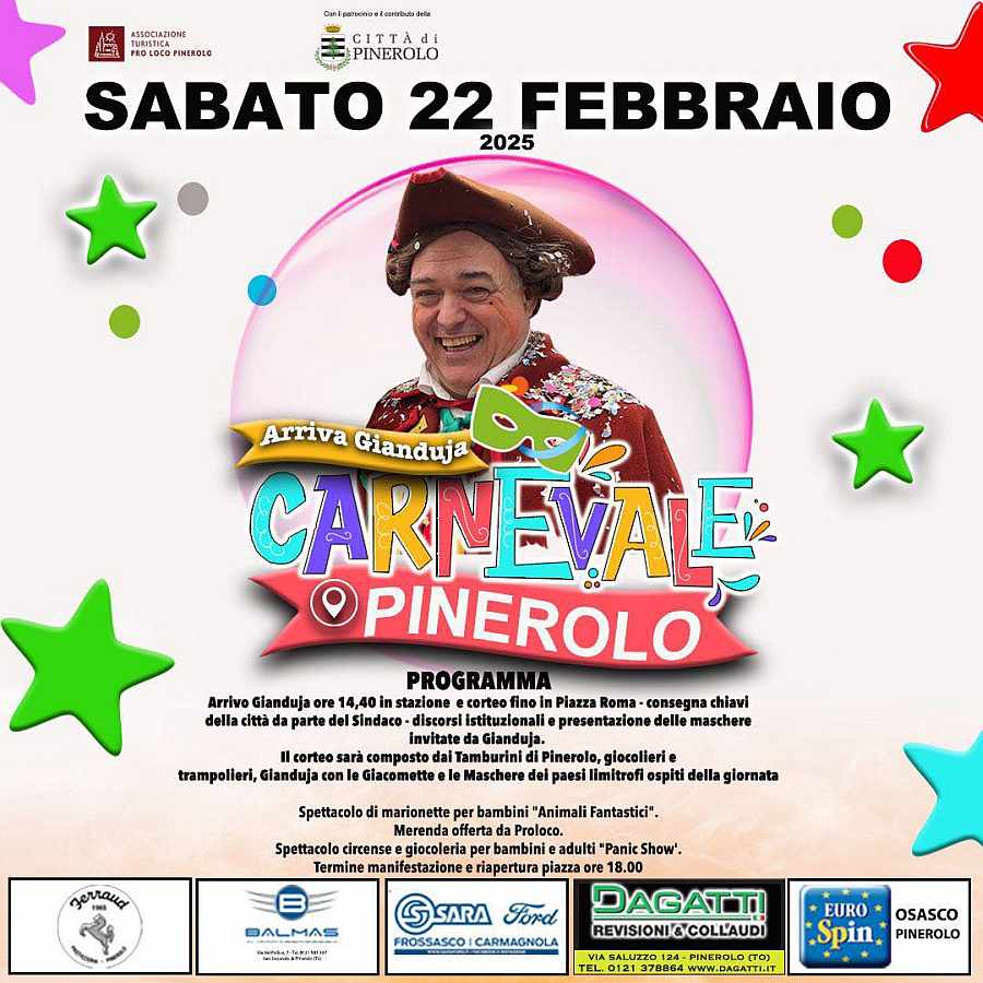SABATO 22 FEBBRAIO 2025 l’arrivo di Gianduja in stazione a PINEROLO alle 14:40, per poi dirigersi in piazza Roma per la consegna delle chiavi della città e a seguire spettacoli per bambini!!