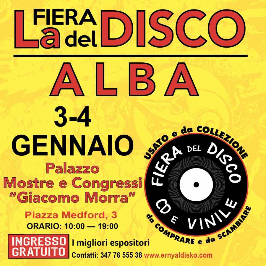 ERNYALDISKO PRESENTA la 2° FIERA DEL DISCO, CD e VINILE, nuovo, usato e da collezione, a ALBA il 3 e domenica 4 Gennaio presso Palazzo Mostre e Congressi “Giacomo Morra”, Piazza Medford 3.