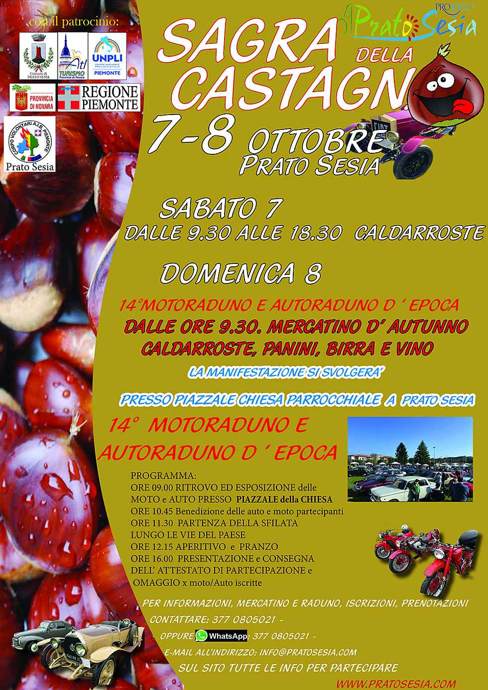 A Prato Sesia, presso il piazzale antistante la chiesa parrocchiale e nell'annesso campo sportivo, si terrà la Sagra della Castagna, organizzata dalla Pro Loco di Prato Sesia dove, oltre alle ormai tradizionali caldarroste, si potranno gustare ottimi panini con la salamella.