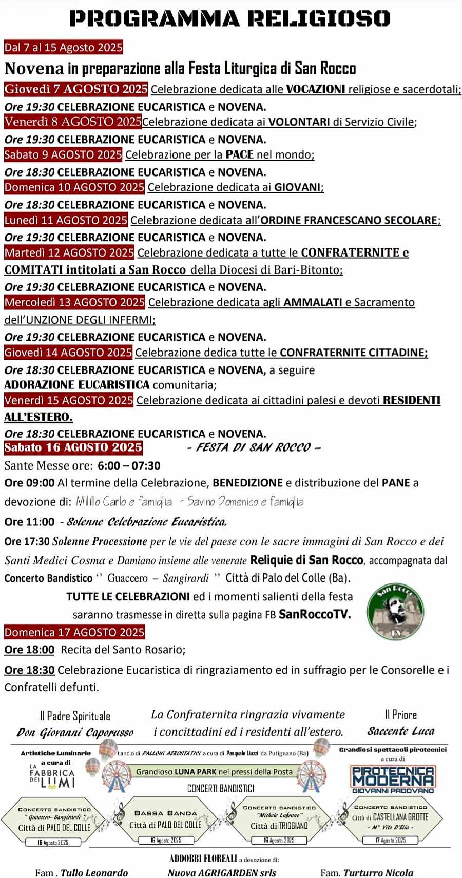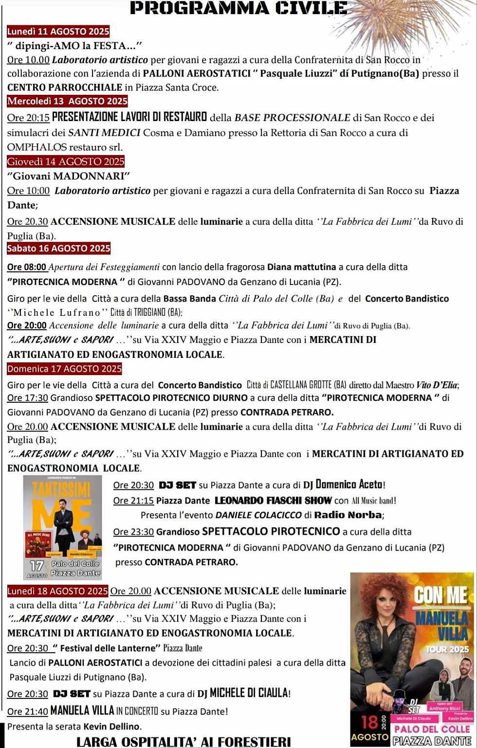 La Festa di San Rocco è una delle ricorrenze più sentite dalla comunità di Palo del Colle, che unisce solenni celebrazioni religiose con un ricco programma di eventi civili.