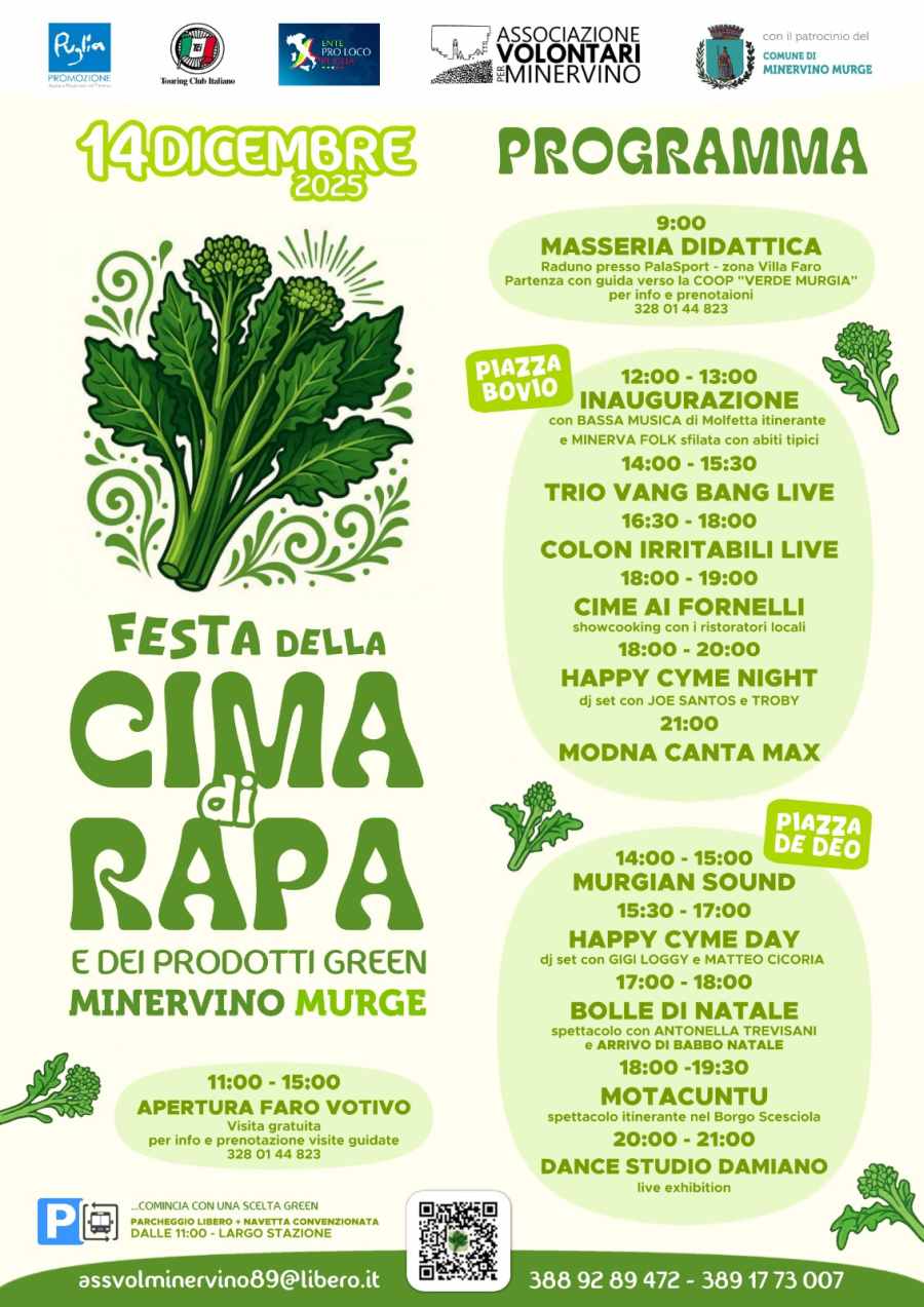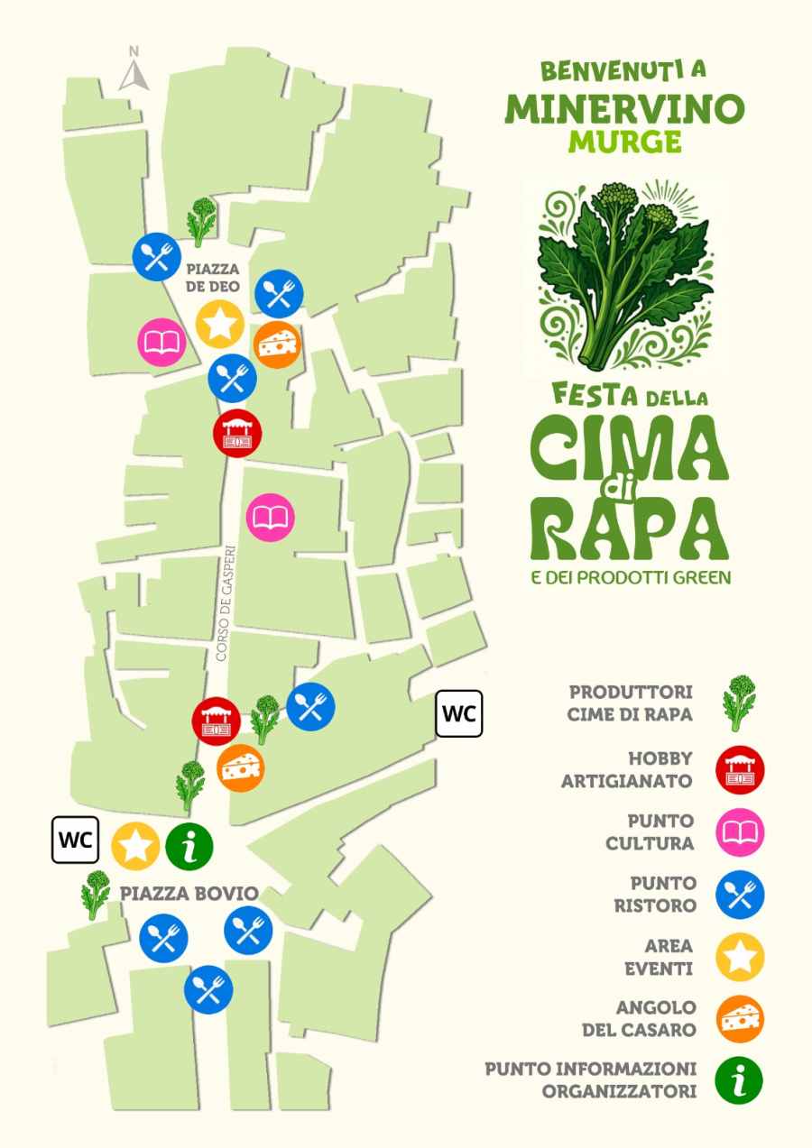 Un percorso itinerante, che si snoderà a partire da Piazza Bovio per poi proseguire lungo Corso De Gasperi e i vicoli annessi della Scesciola, darà il giusto risalto all’intera filiera della Cima di Rapa di Minervino Murge, offrendo la possibilità di poter degustare le diverse e svariate produzioni di questo prodotto, unico nel suo genere.