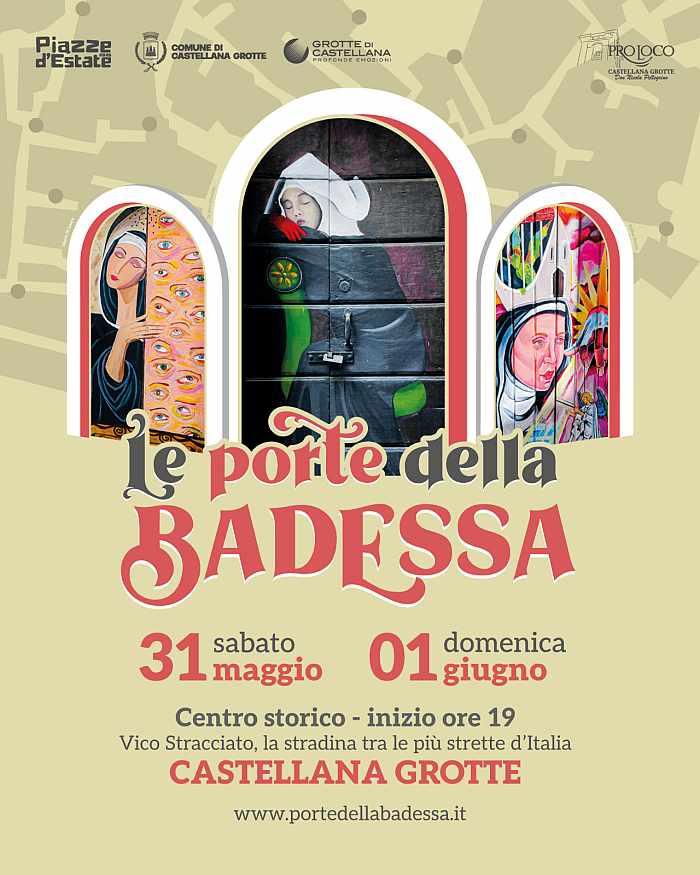 Stabilito il ricco cronoprogramma definitivo per la due giorni (sabato 31 maggio e domenica 1° giugno) interamente dedicata alla quinta edizione delle “Porte della Badessa”, organizzata dalla Pro Loco “don Nicola Pellegrino” e dal Comune di Castellana Grotte nel centro storico, entrando da vico Stracciato, una stradina tra le più strette d’Italia. Obiettivo: rendere bello il brutto attraverso un’operazione culturale e nello stesso tempo di decoro urbano. Il tema delle Badesse “mitrate” del monastero di San Benedetto di Conversano, che dal 1266 fino 1810 con gli stessi poteri del vescovo, esercitarono l’autorità temporale e spirituale su Castellana, è ormai diventato un argomento identitario per i castellanesi, di grande curiosità per i turisti e di interesse da parte di emittenti televisive nazionali.