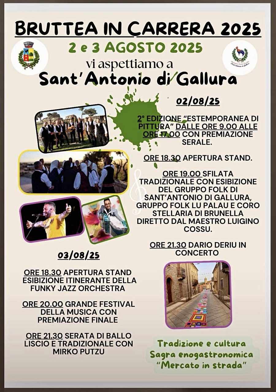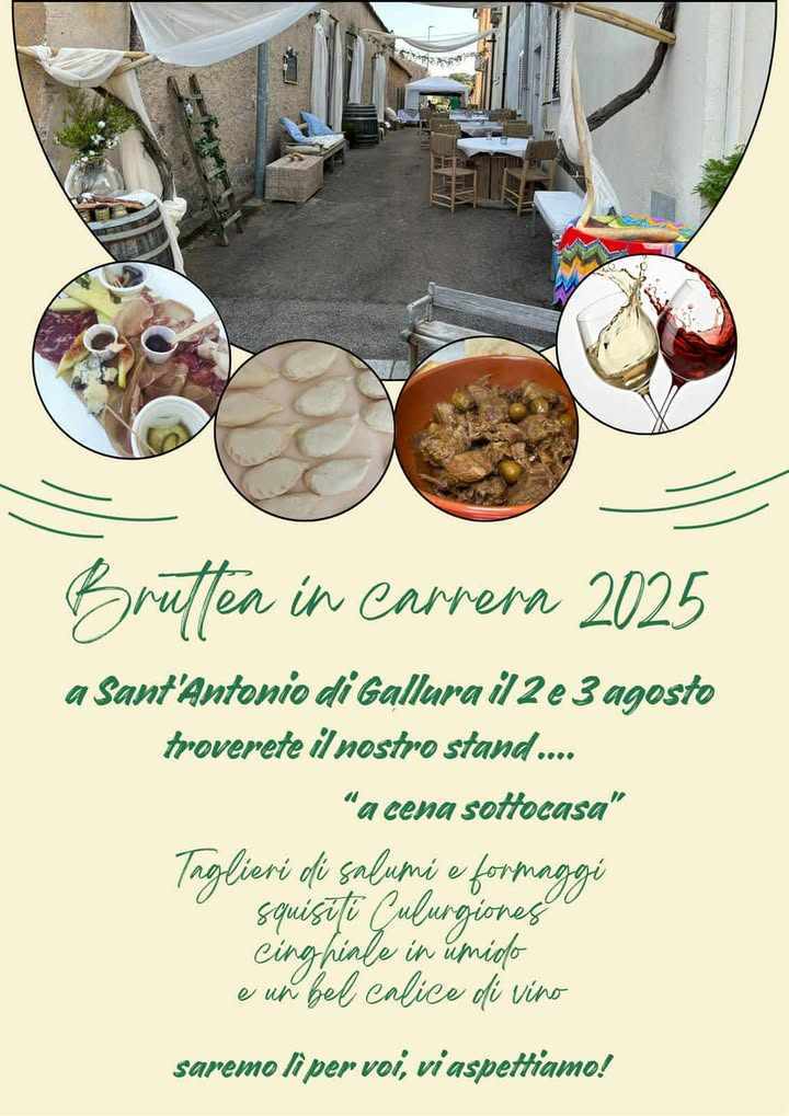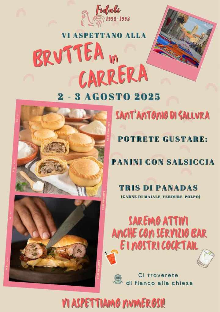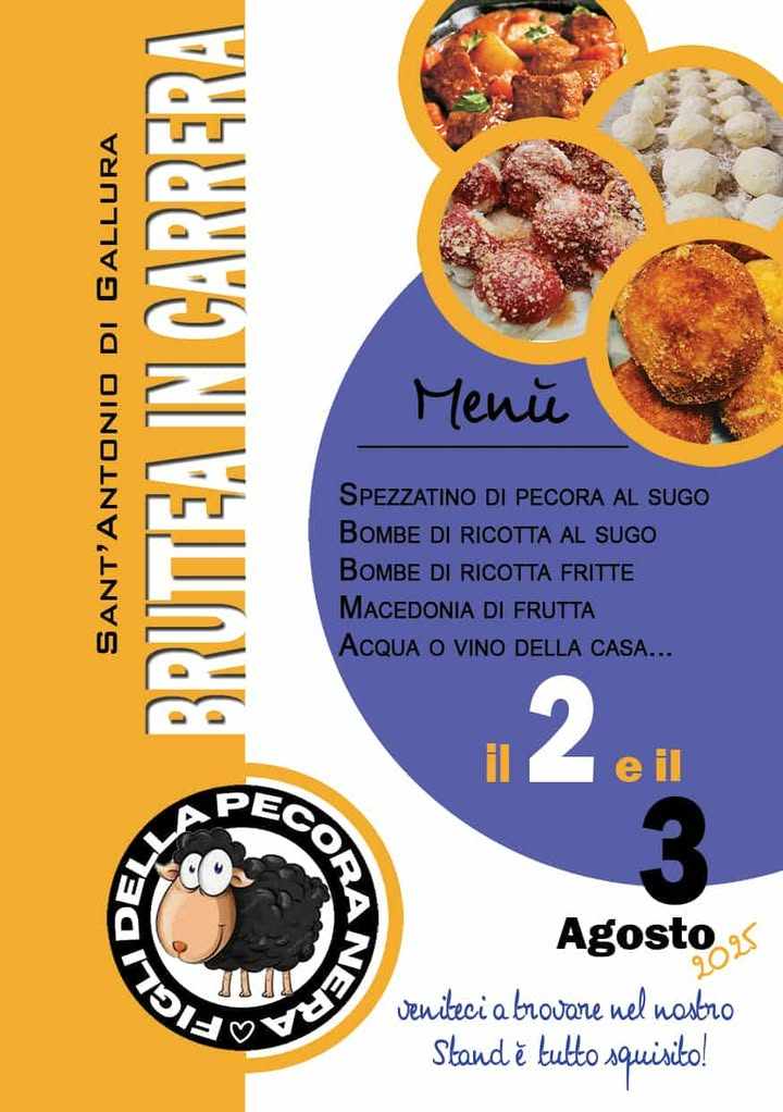 "Bruttea in Carrera" è una locuzione gallurese che significa "Brutta in strada" o "bruttura in strada". Il nome, giocoso e un po' enigmatico, indica in realtà una festa popolare che si concentra sulla celebrazione della pecora bollita, piatto tradizionale della cultura agropastorale gallurese.