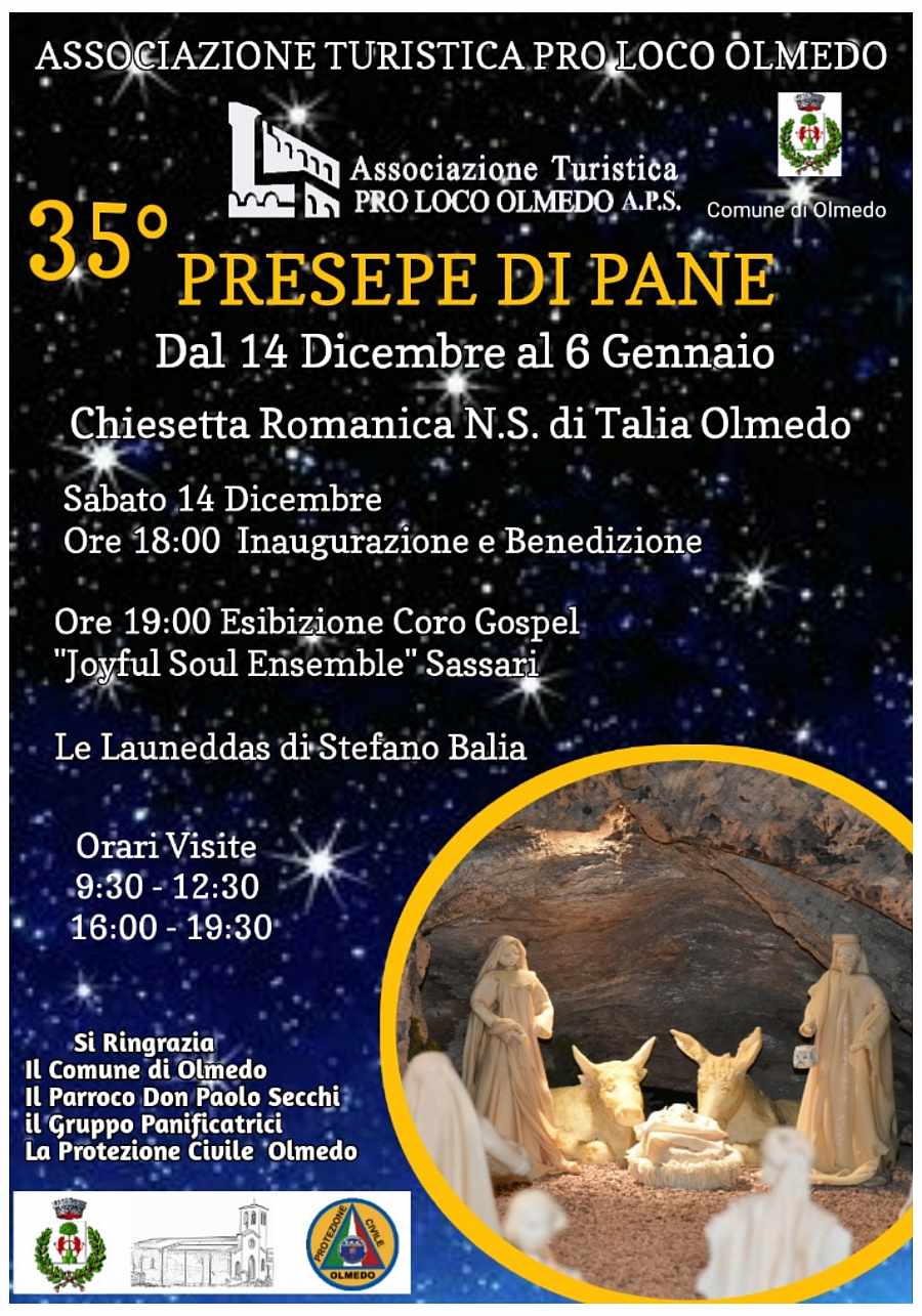 L’evento è reso possibile grazie ai soci volontari della Proloco con la collaborazione del Comune di Olmedo, il Parroco don Paolo Secchi, il Gruppo Panificatrici e la Protezione Civile di Olmedo.
