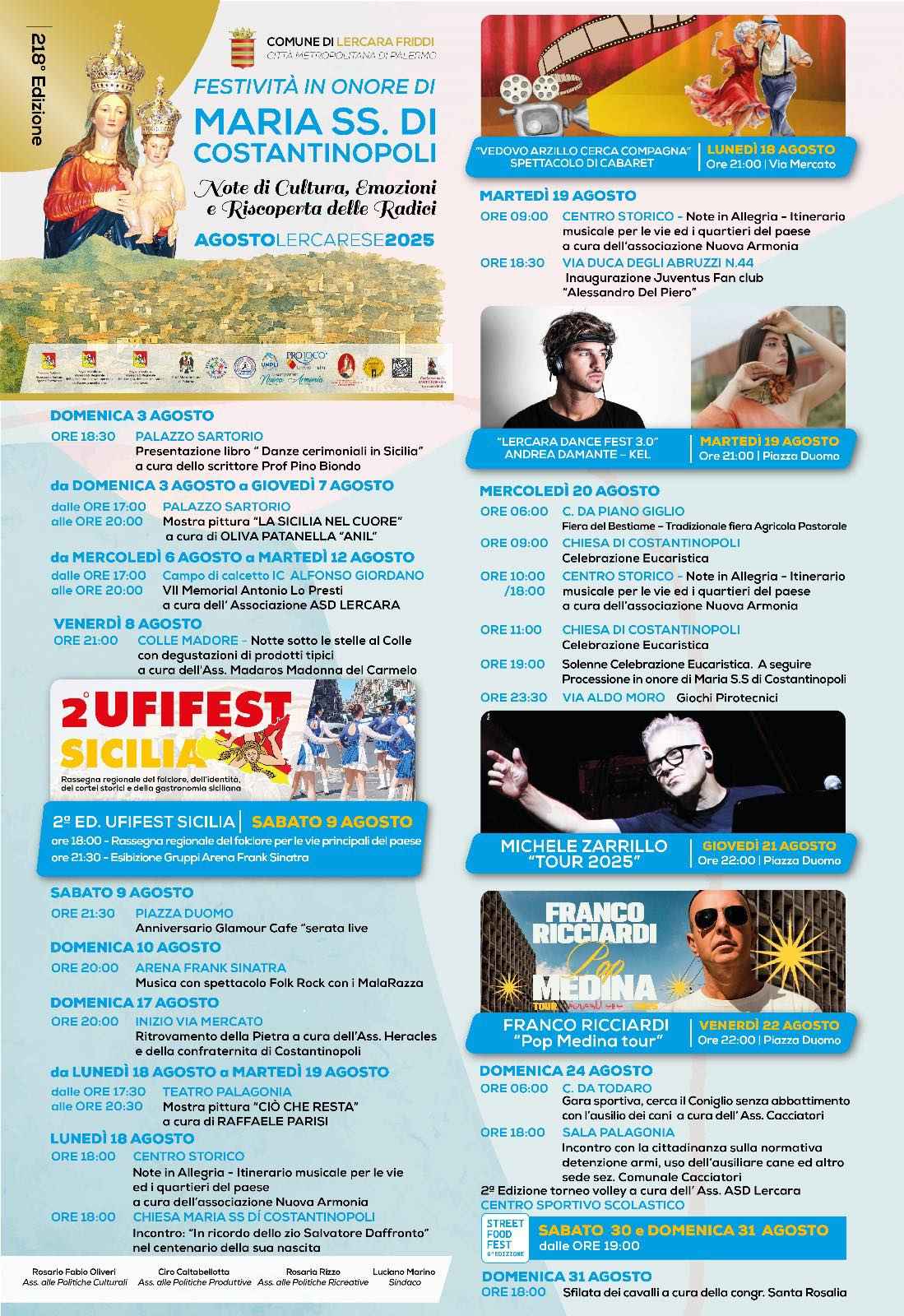L’Amministrazione Comunale di Lercara Friddi è lieta di presentare il programma degli eventi culturali e di intrattenimento previsti per il mese di agosto, caratterizzato da un ricco calendario che coniuga tradizione, musica e valorizzazione del territorio.