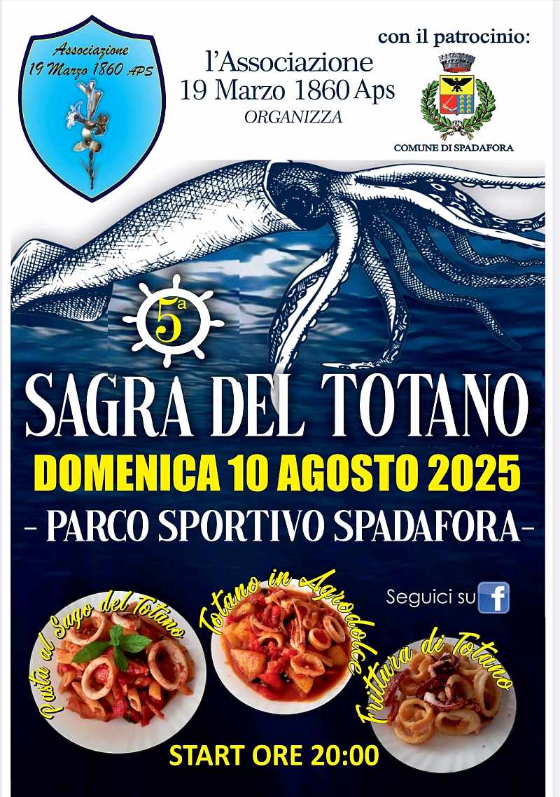 Anche quest’anno torna uno degli appuntamenti più attesi dell’estate spadaforese: la Sagra del Totano, giunta ormai alla sua quinta edizione, organizzata con passione e impegno dall’Associazione 19 Marzo 1860 APS, con il patrocinio del Comune di Spadafora.