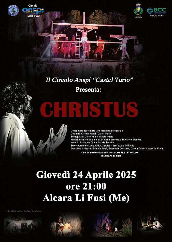 Il suggestivo borgo di Alcara Li Fusi, nel cuore dei Nebrodi, sarà il palcoscenico di un evento unico e straordinario: la rappresentazione del "Christus", organizzata dal Circolo Anspi "Castel Turio" in collaborazione con la corale "V. Gallo" di Alcara Li Fusi.