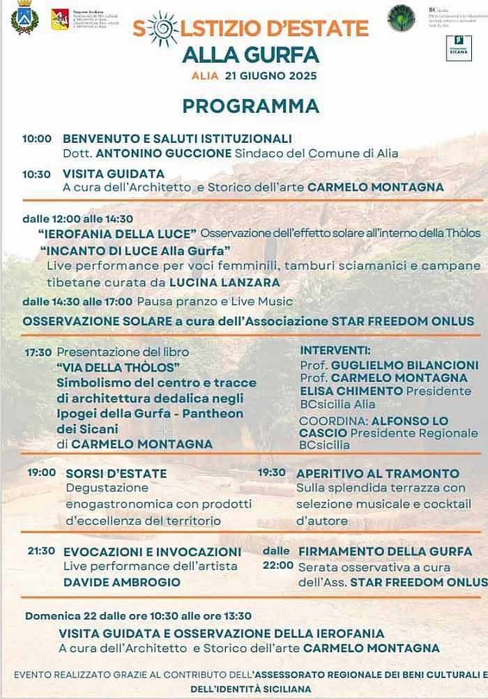 Nella splendida cornice delle Grotte della Gurfa, Alia propone un evento culturale, scientifico e di intrattenimento enogastronomico e musicale unico, in occasione del solstizio d'estate, quando una potente lama di luce penetra nell'oculus della Tholos creando effetti di autentica ierofonia.