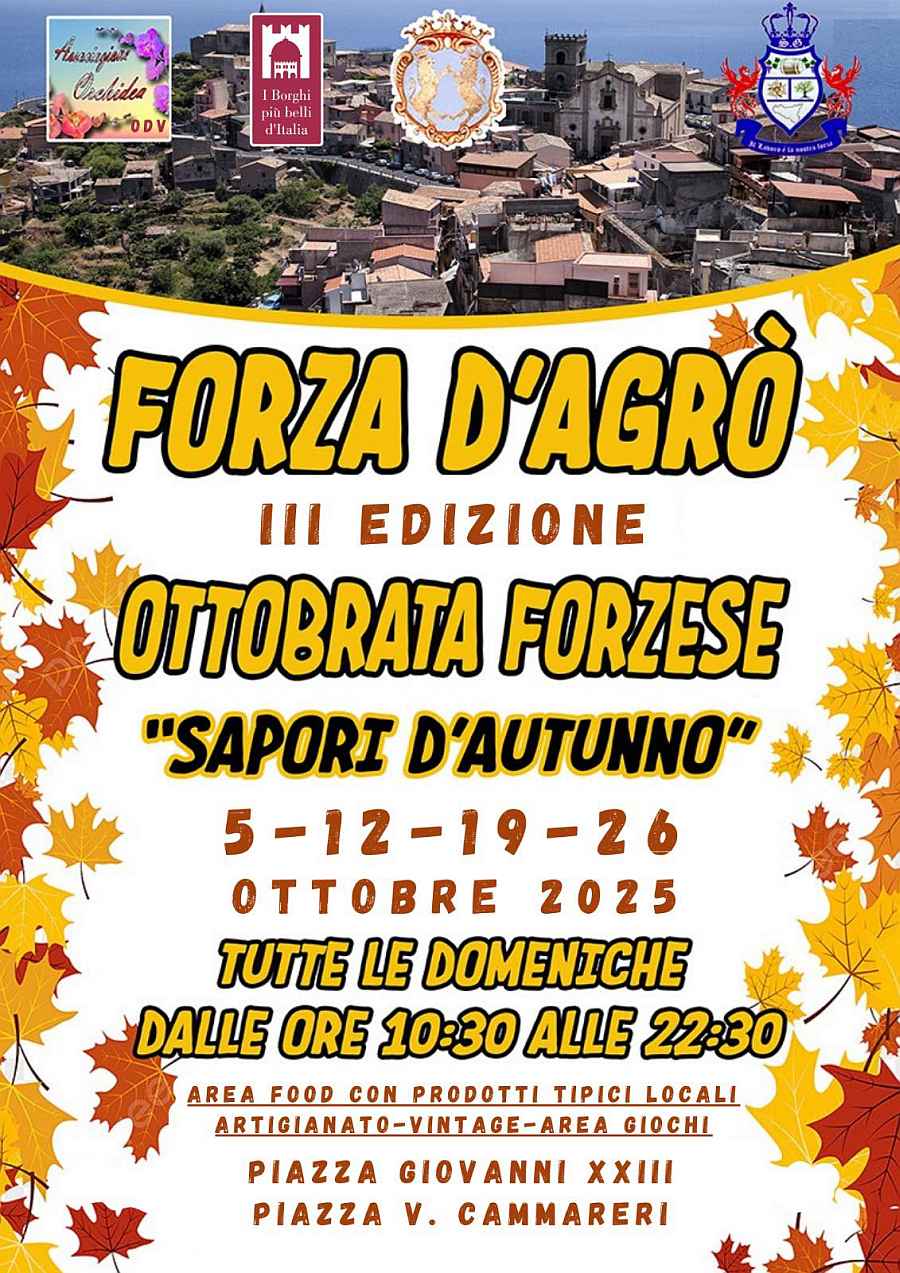L’Associazione Orchidea ODV, col patrocinio del Comune di Forza d’Agrò, uno dei Borghi più belli d’Italia, ha il piacere di presentare la III edizione dell’OTTOBRATA FORZESE “Sapori d’autunno”.