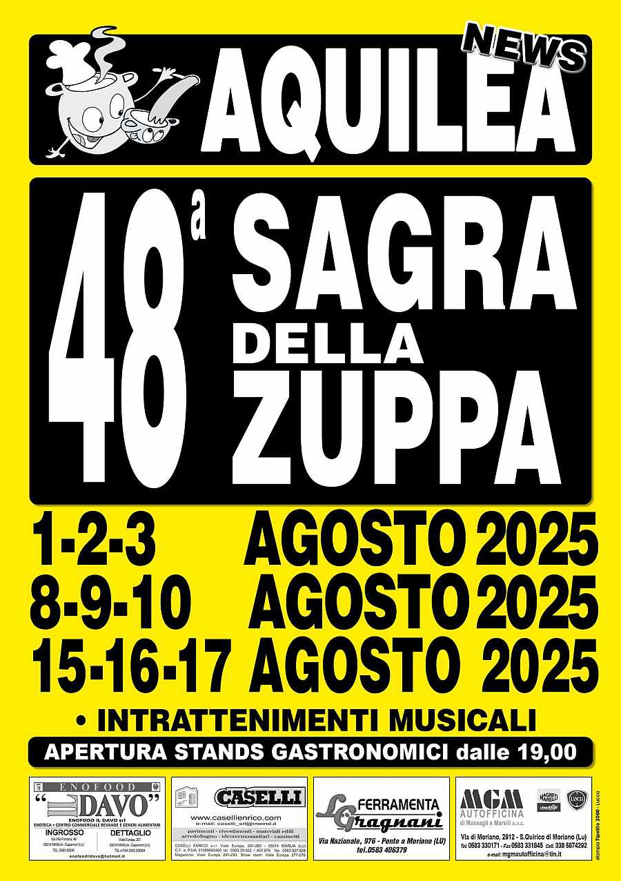 Nella spettacolare location delle colline lucchesi, tra il fresco delle vigne e le piane del paese di Aquilea, si ripete l’annuale tradizione della Sagra della Zuppa.
