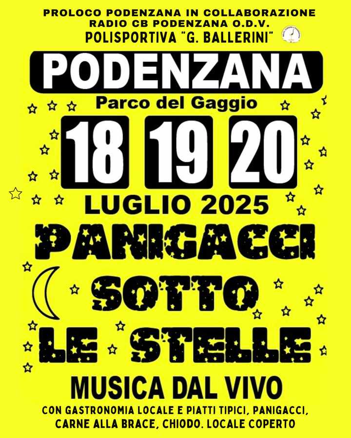 Dal 18 al 20 luglio 2025, al Parco del Gaggio di Podenzana, torna “Panigacci sotto le Stelle”, tre serate imperdibili tra gastronomia locale, musica dal vivo e l’inconfondibile profumo dei veri panigacci!