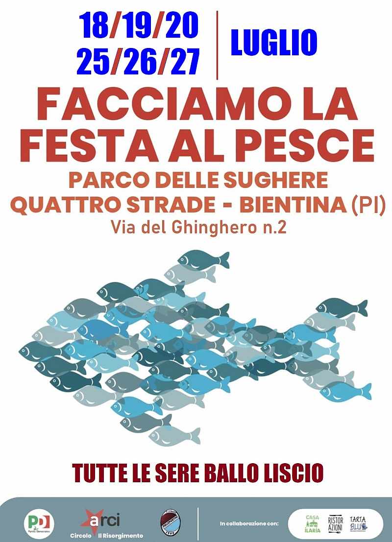 "Facciamo la Festa al Pesce”, organizzata dal Circolo il Risorgimento delle 4 Strade di Bientina (PI), si svolgerà nei giorni di 18,19,20 e 25,26,27 Luglio.