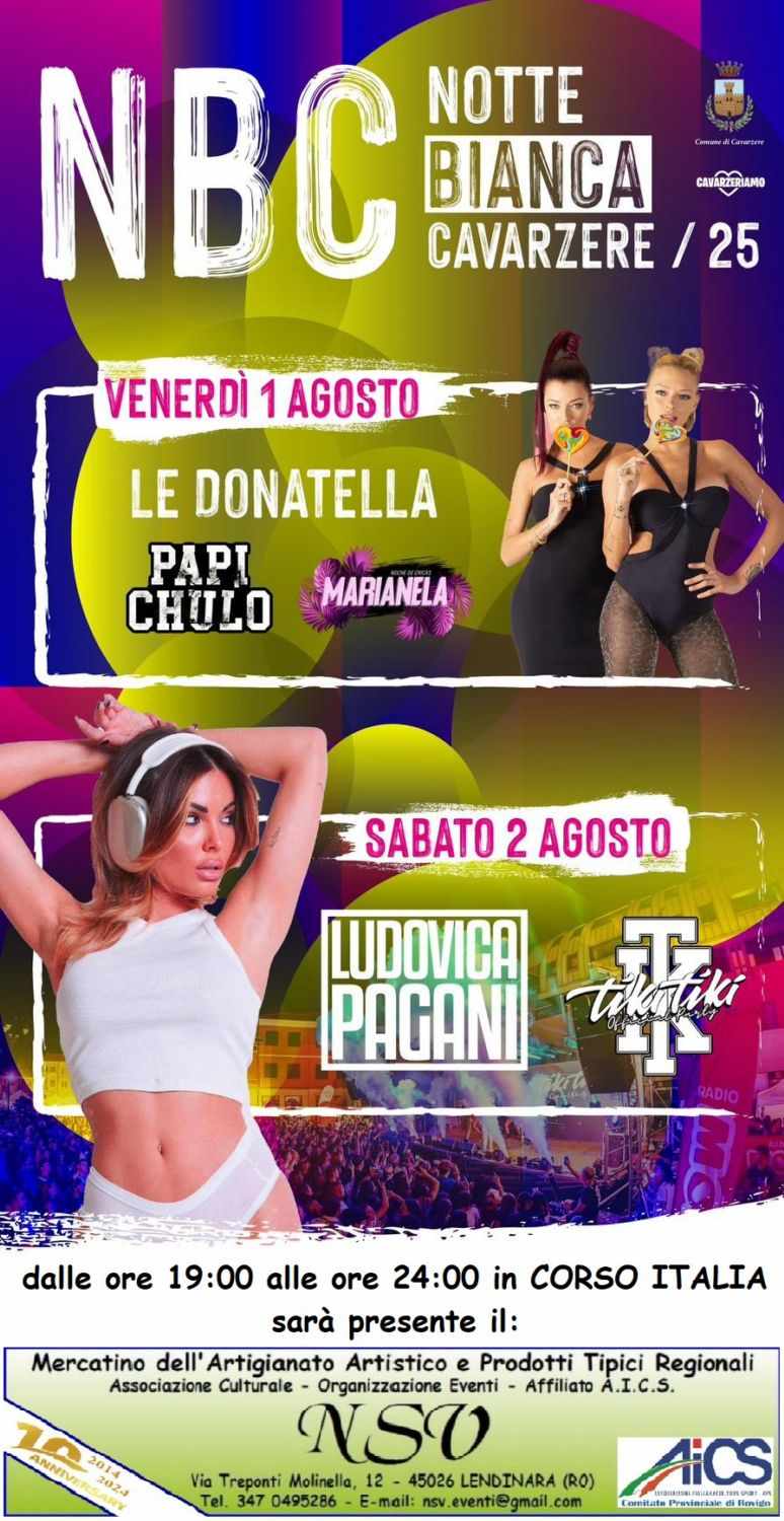 L'Associazione Culturale NSV Organizzazione Eventi APS affiliata A.I.C.S. - Comitato Provinciale di Rovigo, sarà presente in occasione della "Notte Bianca Cavarzere" nelle serate di Venerdì 01 e Sabato 02 Agosto 2025, a Cavarzere (VE), in Corso Italia, dalle ore 19:00 alle ore 24:00 con i Mercatini delle Tradizioni Popolari, dell'Artigianato Artistico e delle Opere d'Ingegno Creativo con curiose ed originali Idee Regalo per la Casa ed il Tempo Libero con dimostrazioni pratiche delle tecniche di lavorazione sul posto, alcune Bancarelle di Prodotti Enogastronomici Tipici Regionali ed Italiani con Degustazioni e Specialità Alimentari Dolci e Salate Stagionali prodotti artigianalmente per esaltare i Gusti e i Sapori di una tradizione antica ormai persa.