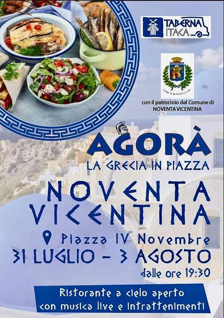 "Agorà - La Grecia in Piazza" è un evento che trasforma la piazza principale di Noventa Vicentina in un autentico ristorante greco a cielo aperto.