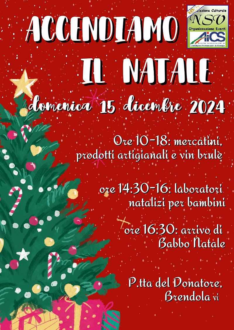 L'Associazione Culturale NSV Organizzazione Eventi APS affiliata A.I.C.S. - Comitato Provinciale di Rovigo, sarà presente in occasione della Manifestazione "Accendiamo il Natale" nella giornata di Domenica 15 Dicembre 2024, a Brendola (VI), in Piazza del Donatore (zona Impianti Sportivi), dalle ore 10:00 alle ore 18:00 con