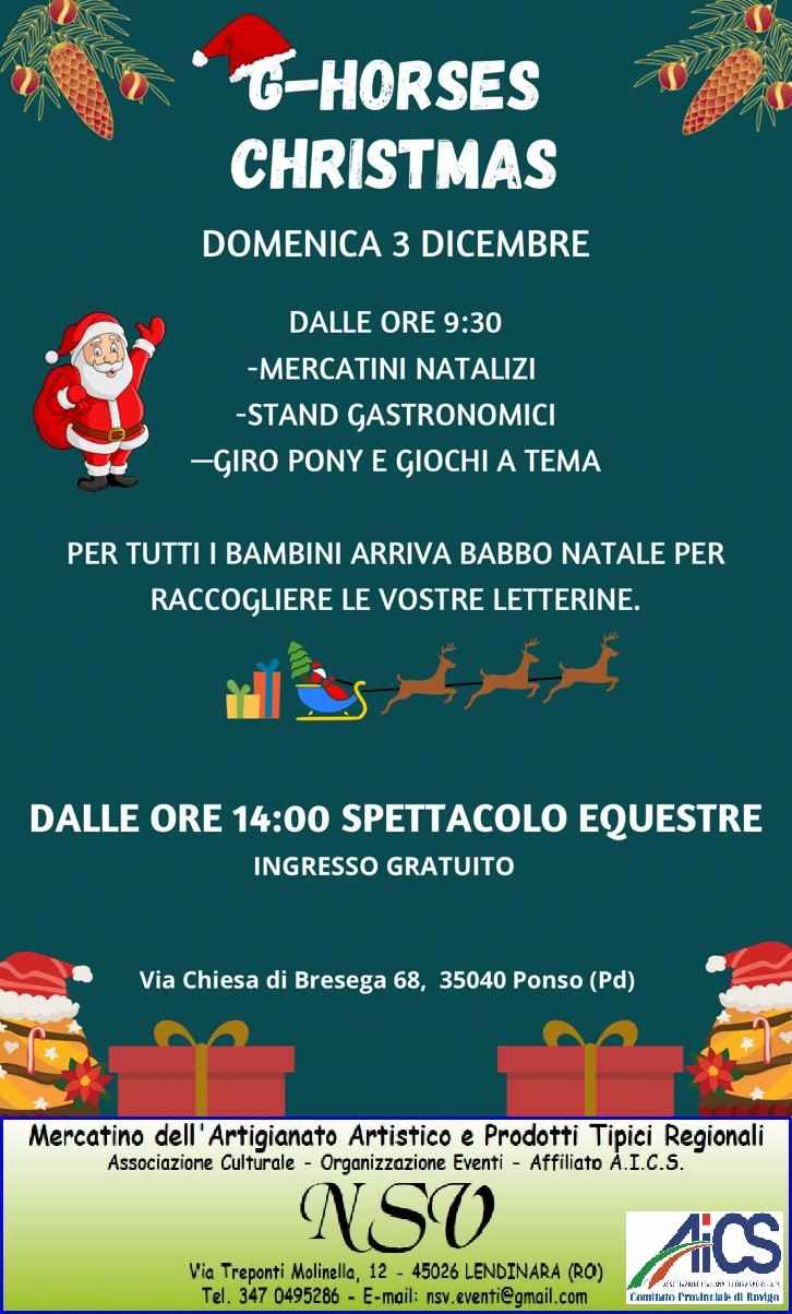 L'Associazione Culturale NSV Organizzazione Eventi APS affiliata A.I.C.S. - Comitato Provinciale di Rovigo, sarà presente in occasione della Manifestazione "G-Horses in Christmas" nella giornata di Domenica 03 Dicembre 2023, a Bresega di Ponso (PD), presso il Centro di Equitazione G-Horses, in Via Chiesa di Bresega 68, dalle ore 09:30 alle ore 19:00, con :