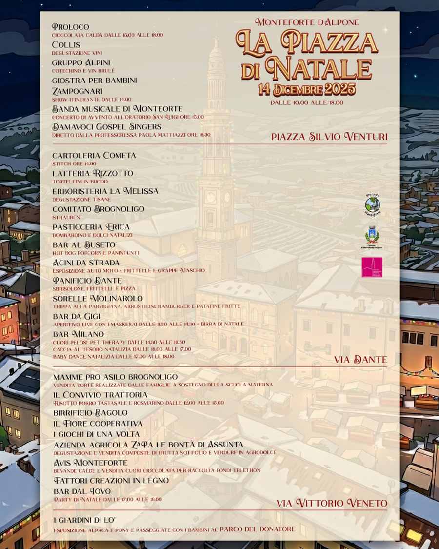 Monteforte d’Alpone (Verona) si prepara a immergersi nella magia delle festività con La Piazza di Natale, l’evento che domenica 14 dicembre 2025, dalle 10.00 alle 18.00, trasformerà Piazza Silvio Venturi in un vivace villaggio natalizio ricco di musica, sapori e tradizioni.