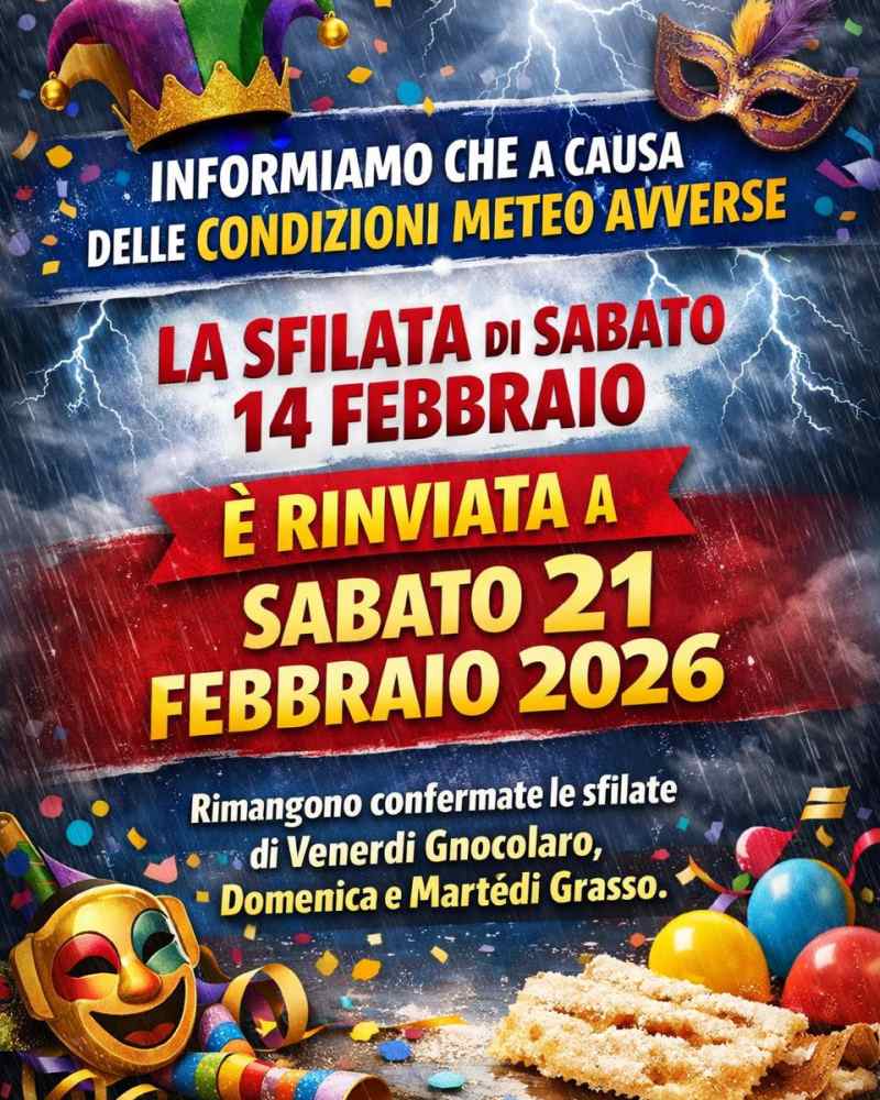 La Pro Loco di Monteforte d’Alpone informa che, a causa delle condizioni meteo avverse previste per sabato 14 febbraio, la 39ª Grande Sfilata Notturna di carri allegorici e gruppi mascherati è stata rinviata a sabato 21 febbraio, con inizio alle ore 20.00.