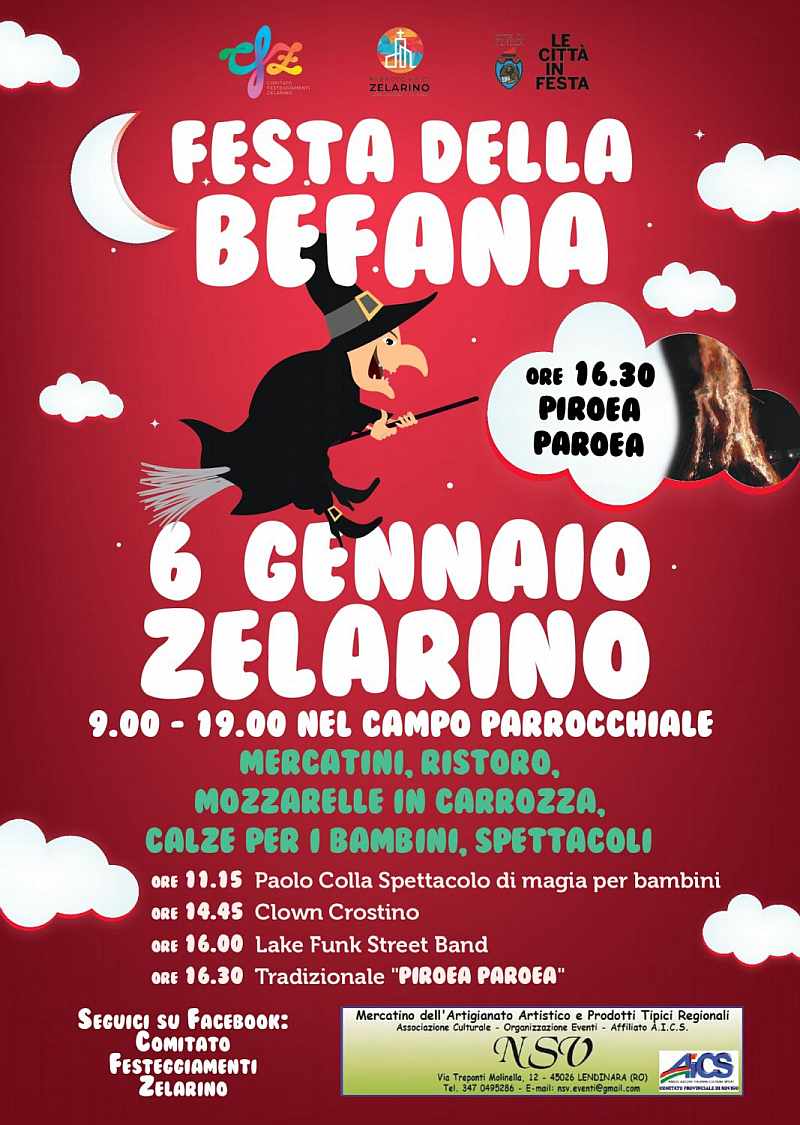 L'Associazione Culturale NSV Organizzazione Eventi APS affiliata A.I.C.S. - Comitato Provinciale di Rovigo, sarà presente in occasione della "Festa della Befana" nella giornata di Lunedì 06 Gennaio 2025 a Zelarino (VE), nel Piazzale della Parrocchia in Via Castellana, 70 dalle ore 09:00 alle ore 19:00 con: