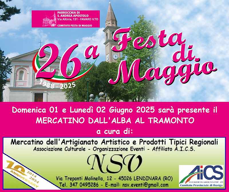 L'Associazione Culturale NSV Organizzazione Eventi APS affiliata A.I.C.S. - Comitato Provinciale di Rovigo, sarà presente in occasione della "26^ Festa di Maggio" nelle giornate di Domenica 01 e Lunedì 02 Giugno 2025, a Favaro Veneto (VE) in Via Altinia, 131, con il "Mercatino dall'Alba al Tramonto" con la presenza di: