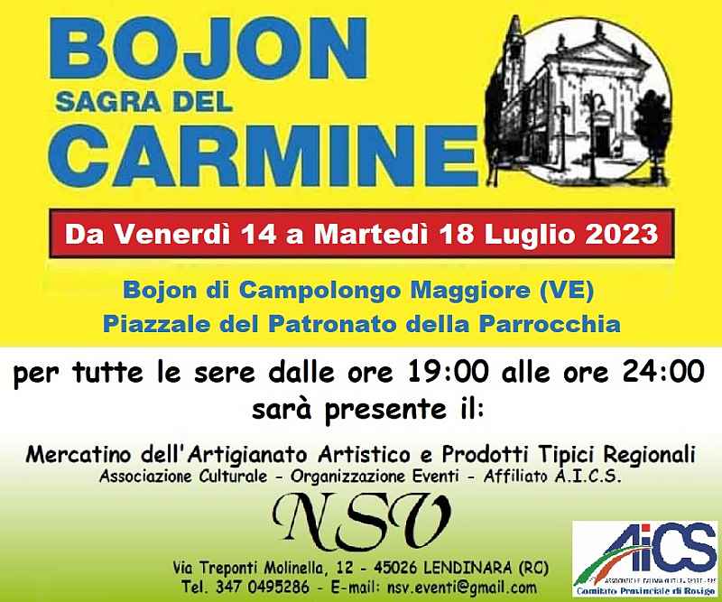 L'Associazione Culturale NSV Organizzazione Eventi APS affiliata A.I.C.S. - Comitato Provinciale di Rovigo, sarà presente in occasione della "Sagra del Carmine" nelle serate dal 14 al 18 Luglio 2023, a Bojon di Campolongo Maggiore (VE), nel Piazzale del Patronato in Via Villa, dalle ore 19:00 alle ore 24:00 con: