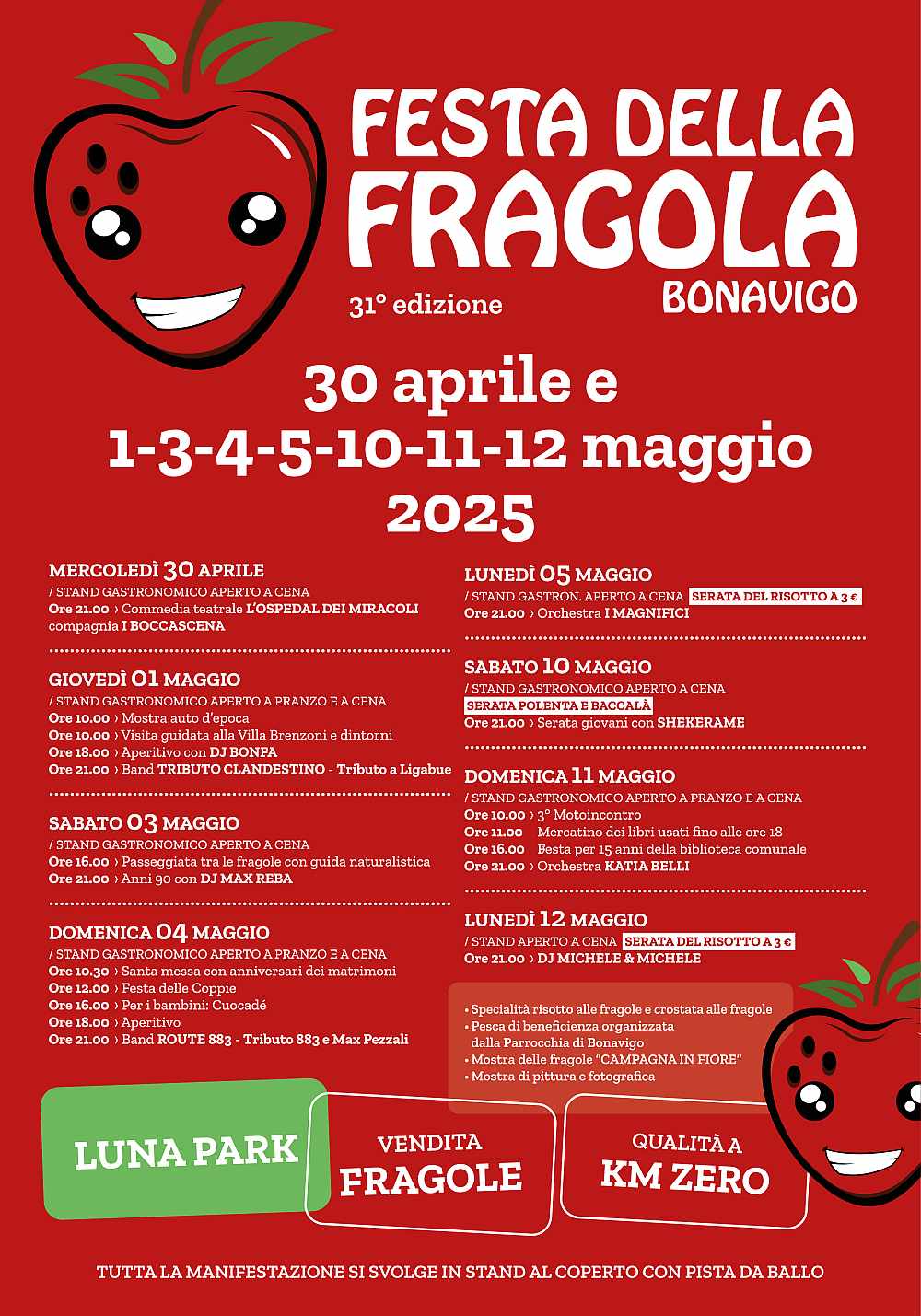 Ogni anno, tra la fine di aprile e i primi di maggio, il piccolo comune si trasforma in un centro di celebrazione dedicato alla fragola, frutto simbolo di dolcezza e freschezza. L’evento attira visitatori da tutta Italia grazie al mix unico di tradizione, enogastronomia e intrattenimento.