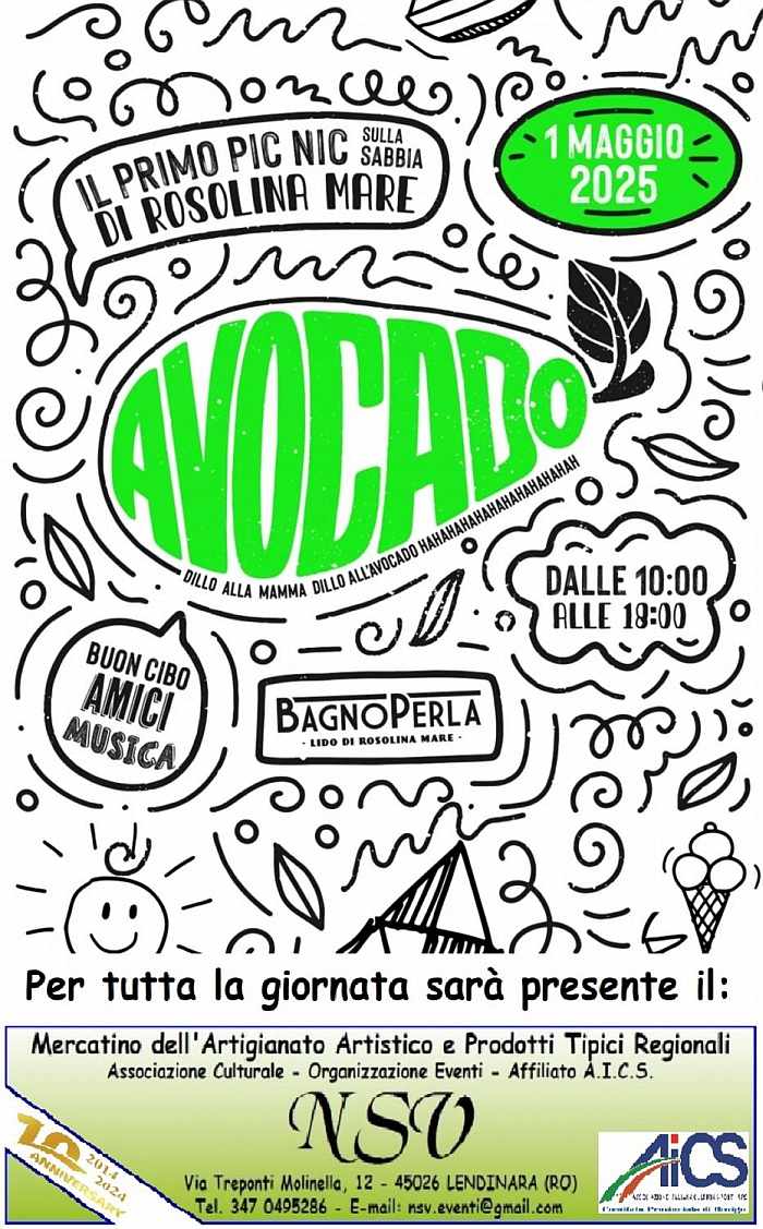 L'Associazione Culturale NSV Organizzazione Eventi APS affiliata A.I.C.S. - Comitato Provinciale di Rovigo, sarà presente in occasione di "AVOCADO - Il Primo Pic Nic sulla Sabbia" nella giornata di Giovedì 01 Maggio 2025, a Rosolina Mare (RO), al Bagno Perla in Via Torino, 10, dalle ore 10:00 alle ore 19:00, con il Mercatino delle Tradizioni Popolari, dell'Artigianato Artistico e delle Opere d'Ingegno Creativo con curiose ed originali Idee Regalo per la Casa ed il Tempo Libero con dimostrazioni pratiche delle tecniche di lavorazione sul posto.