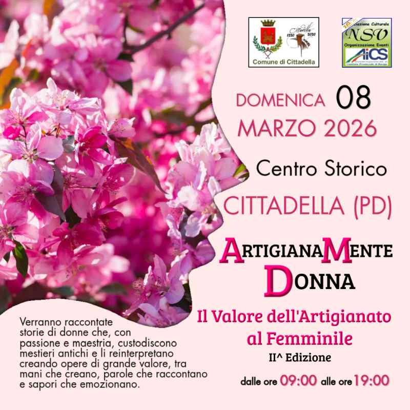 L’Associazione Culturale NSV Organizzazione Eventi APS, affiliata A.I.C.S. – Comitato Provinciale di Rovigo, con il Patrocinio del Comune di Cittadella (PD), promuove e organizza la Manifestazione “ArtigianaMente Donna – Il Valore dell’Artigianato al Femminile”, in programma Domenica 08 Marzo 2026, nella splendida cornice del Centro Storico di Cittadella (PD), dalle ore 09:00 alle ore 19:00.