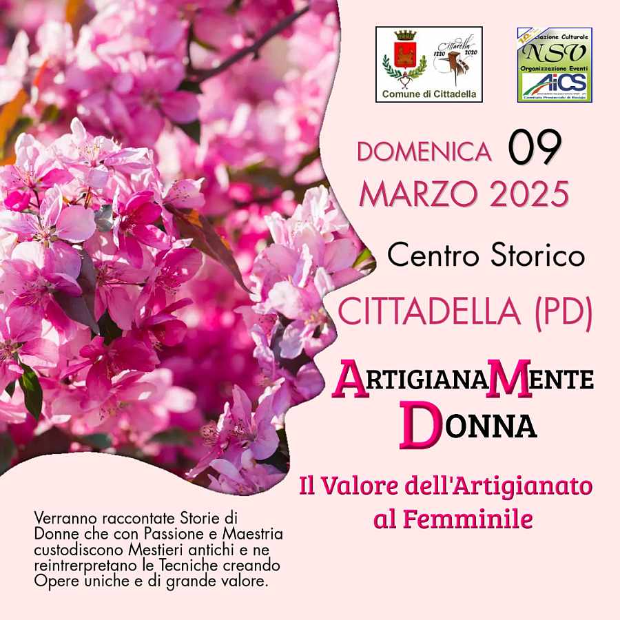 L'Associazione Culturale NSV Organizzazione Eventi APS affiliata A.I.C.S. - Comitato Provinciale di Rovigo, promuove ed organizza la Manifestazione "ArtigianaMente Donna - Il Valore dell'Artigianato al Femminile" che si svolgerà Domenica 09 Marzo 2025 nella splendida cornice del Centro Storico di Cittadella (PD), dalle ore 09:00 alle ore 19:00.