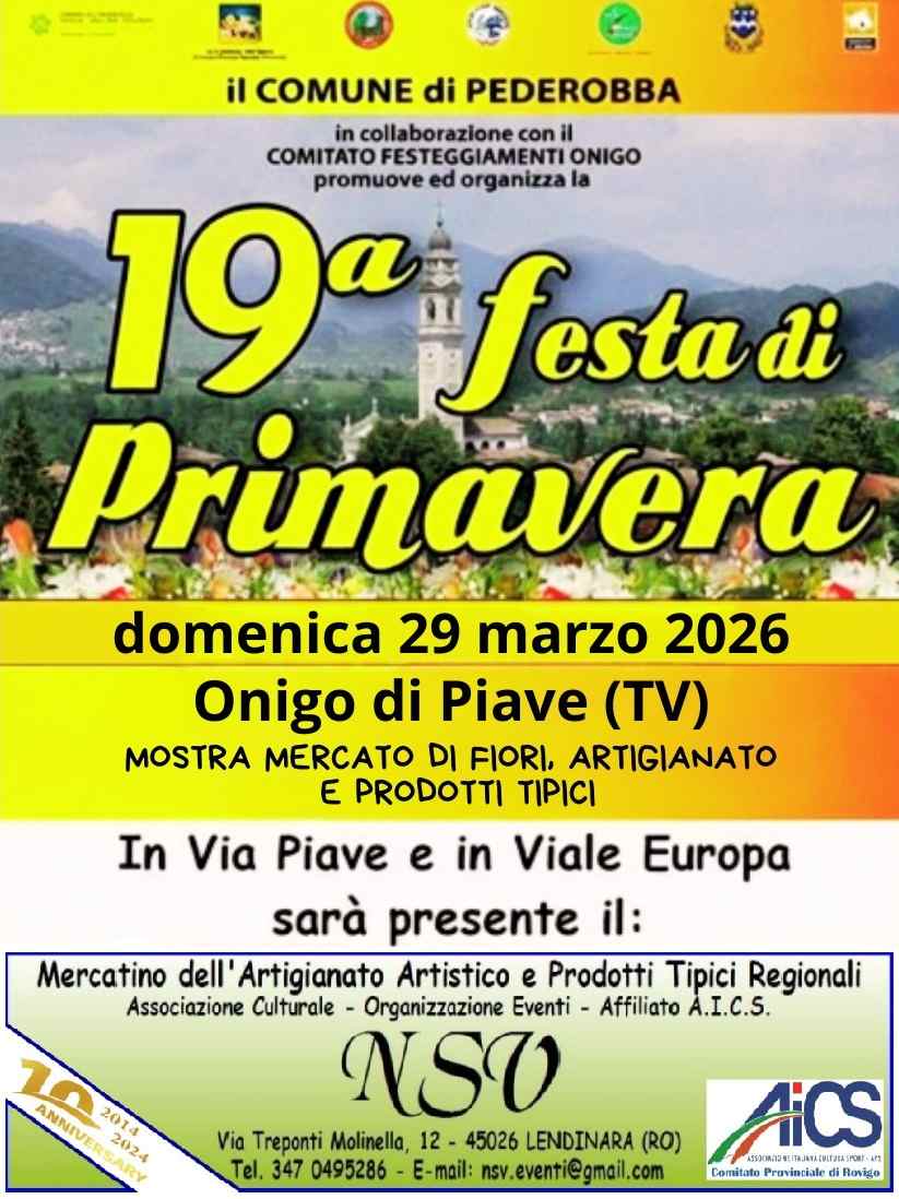 L'Associazione Culturale NSV Organizzazione Eventi APS affiliata A.I.C.S. - Comitato Provinciale di Rovigo, sarà presente in occasione della "19^ Festa di Primavera" nella giornata di Domenica 29 Marzo 2026, a Onigo di Piave (TV), in Via Piave e Viale Europa, dalle ore 09:00 alle ore 19:00 con: